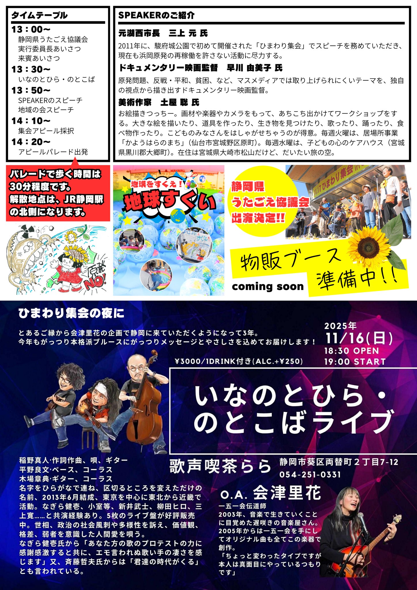 2025年11月16日(日)、静岡市の駿府城公園(東御門前広場)にて、「浜岡原発の再稼働を許さない!! 11.16ひまわり集会inしずおか」が開催されます。ゲストは、「いなのとひら・のとこば」さん。集会では、経産省前テントひろばの「反原発美術館テント」(実物)も再建展示されます。反原発美術館内で、宮城の美術作家・土屋聡さんの作品を展示します。私も参加予定です。静岡近郊の皆さま、ぜひご参加ください!
