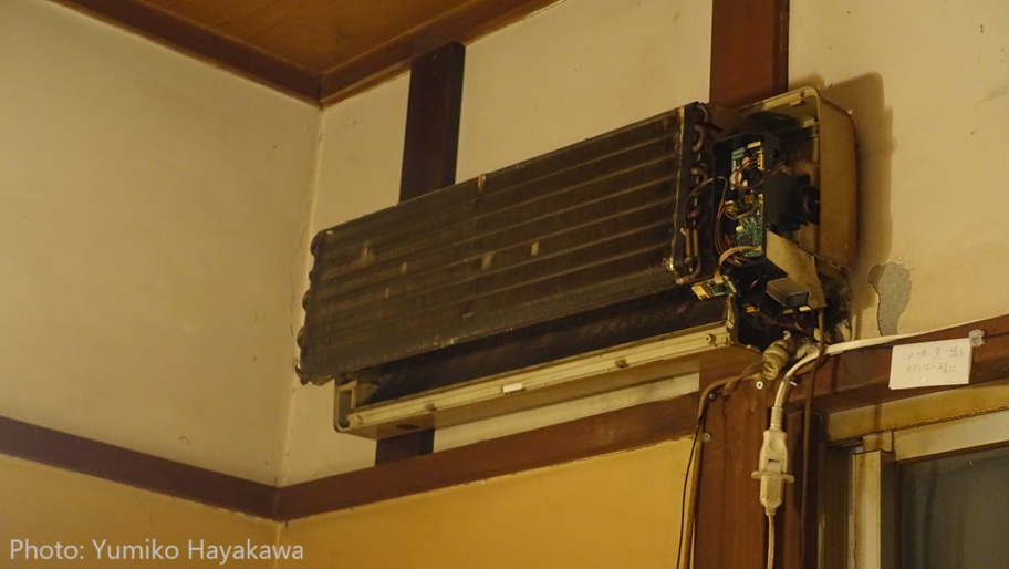 成田さんがここに引っ越してくる際、前居住者の家財道具は大家さんが運び出してくれた。しかし、部屋の掃除や修繕は一切されておらず、埃と汚れまみれだったそうだ。エアコンは焦げたように真っ黒で、室内には壊れた電球がぶら下がり、雨戸と網戸は破れたまま。